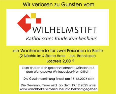 Die Glücksfee Ulle hat am 18.12.2019 das Gewinnlos für die Verlosung zu Gunsten vom Kinder- Hospiz Sternenbrücke gezogen. Das Los trägt die Nummer 00236. Der Gewinner wird gebeten sich beim Wandsbeker Winterzauber zu melden. Herzlichen Glückwunsch.